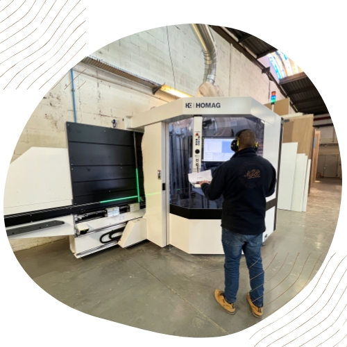 Un atelier équipé de machines numériques et dernière génération, assurant une production précise, rapide et constante : scie à panneaux numérique, centre d’usinage CNC, plaqueuses de chants, cabine de vernissage.